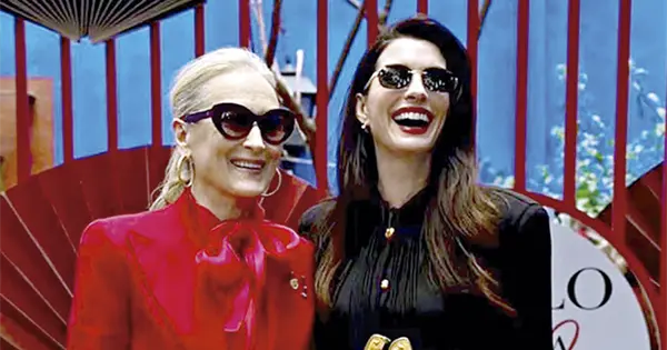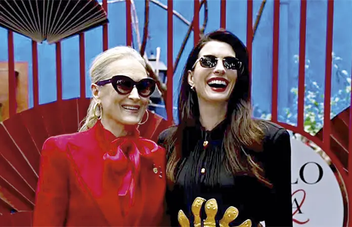 El diseño se complementa con una silueta fluida y movimiento en la falda, logrando un equilibrio entre estructura y ligereza. A esto se suman gafas oscuras de inspiración retro y labios en tono rojo profundo, un guiño directo al ADN sofisticado del personaje de Andy Sachs en su versión más evolucionada.