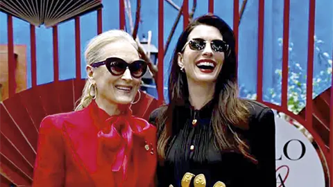 Más allá del momento cinematográfico, el verdadero guiño estuvo en la moda: ambas actrices demostraron que el universo de la revista Runway sigue más vigente que nunca, incluso fuera de la pantalla.