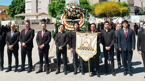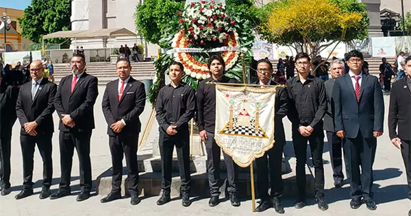 Matehuala.- Con un acto cívico fue conmemorado el 220 aniversario del natalicio de Benito Juárez, estuvieron miembros de la Logia Masónica de Matehuala, autoridades municipales y alumnos de varias instituciones educativas.