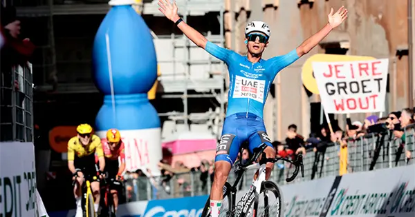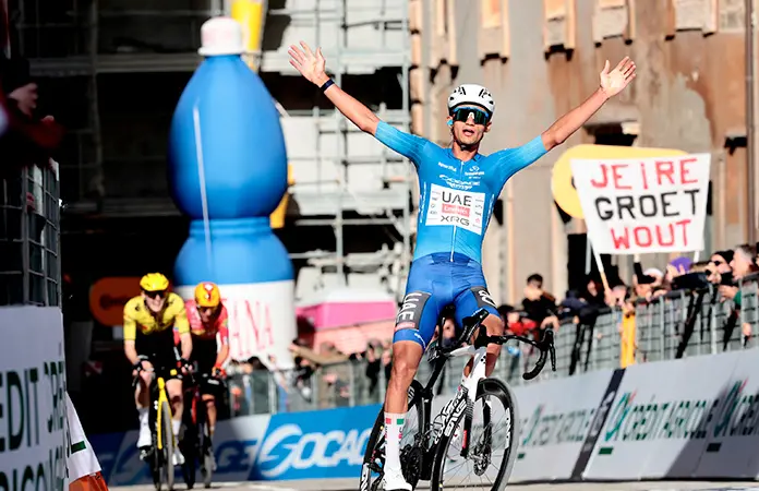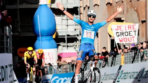 Se levantó en el tercer ascenso al Muro della Madonna delle Carceri para llegar a la meta en Camerino (3km con 8,8% y picos del 18%) y superó a su amigo Pellizzari para batirse en el duelo final con Jorgeson. El resultado, otro pequeño cambio de ritmo y brazos en alto en solitario en la meta para conquistar 42 segundos de ventaja en la general con su principal perseguidor, el propio Pellizzari, y uno más sobre Jorgenson, sus grandes rivales esta semana.