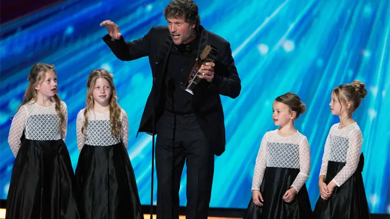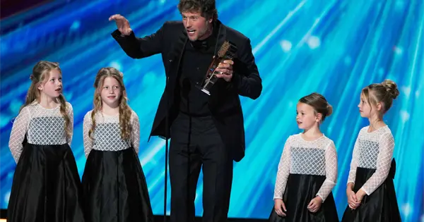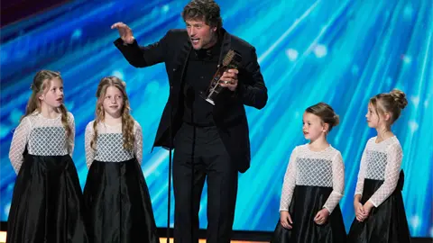 Stafford llevó a sus cuatro hijas , todas vestidas con vestidos idénticos en blanco y negro, al escenario para aceptar el premio.