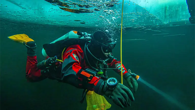 Eso pone a prueba al equipo de apoyo en superficie, que debe operar el equipo para mantener al buzo a salvo mientras se protege de su propio riesgo de congelación. También tienen que aprender a convertirse en buzos de seguridad en caso de una emergencia, como si el buzo principal no puede encontrar el agujero en el hielo para salir a la superficie después de 45 minutos bajo el agua.