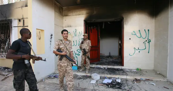 La noche del 11 de septiembre de 2012, según han dicho funcionarios estadounidenses, al menos 20 militantes armados con AK-47 y lanzagranadas irrumpieron en la puerta del complejo consular y prendieron fuego a los edificios. El incendio provocó la muerte del embajador Stevens y del empleado del Departamento de Estado Sean Smith.