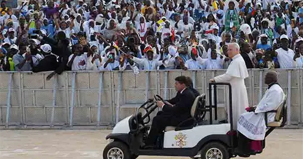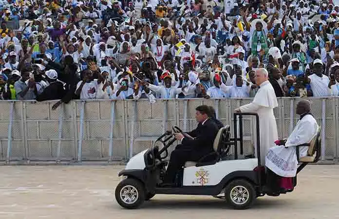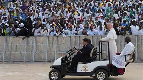 Muxima, Angola.- El papa volvió a lanzar un nuevo llamamiento para ser "constructores de justicia y portadores de paz" y exclamó: "¡Es el amor el que debe triunfar, no la guerra!", en su discurso del rezo del rosario en el santuario de Mama Muxima, en Angola, donde se trasladó en la segunda jornada de su visita al país.