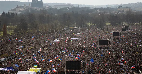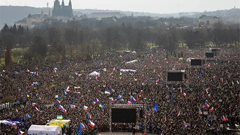 Las personas en la multitud, que los organizadores estimaron en alrededor de 200,000, ondeaban banderas nacionales checas, mientras que una de las pancartas exhibidas decía: "Defendamos la democracia".