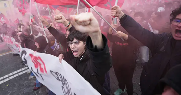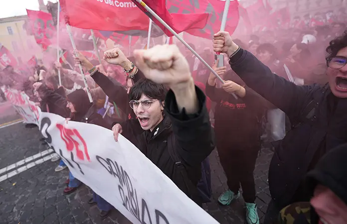 En el centro de Roma, manifestantes que ondeaban banderas rojas de sindicatos, así como banderas palestinas y cubanas, coreaban "Gobierno de Meloni, dimite" antes de que la concentración terminara de forma pacífica.