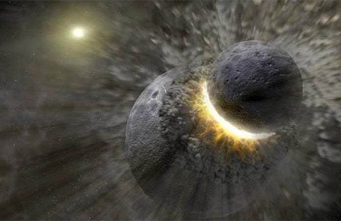 La mayoría de estos recién nacidos planetoides, con sus irregulares orbitas, caían al Sol consumiéndose u otros escapaban al espacio. Ocurrió por ese tiempo que un planetoide errático del tamaño de Marte, colisiono con la muy joven Tierra. El impacto no fue directo; cayo en forma oblicua y gran parte de material fue lanzado al espacio o quedo orbitando alrededor de nuestro vapuleado planeta. La gravedad volvió a reunir los fragmentos y se originó nuestro satélite.
