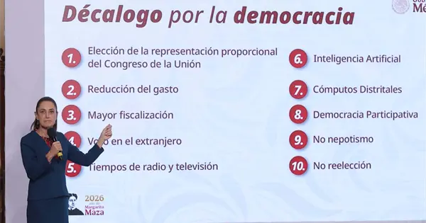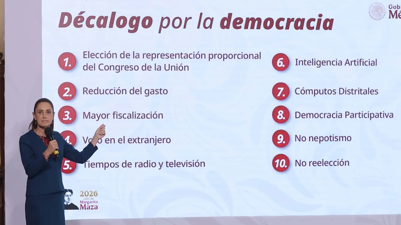 En el Salón Tesorería, presentó el "decálogo por la democracia": elección de la representación proporcional del Congreso; reducción del gasto; mayor fiscalización; voto en el extranjero; tiempos de radio y televisión; inteligencia artificial; cómputos distritales; democracia participativa; no nepotismo; y no reelección.
