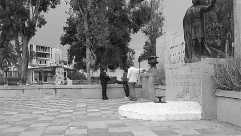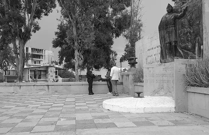 A metros de la unidad, en el monumento de la glorieta, la oficial llamaba la atención a la pareja a la que revisa a detalle una mochila; en determinado momento la jovencita le extiende su billetera, a lo que ella la toma, abre y se observa cuando toma un billete de 200 pesos.