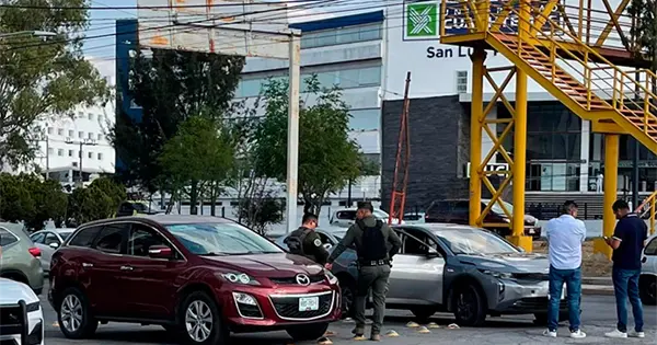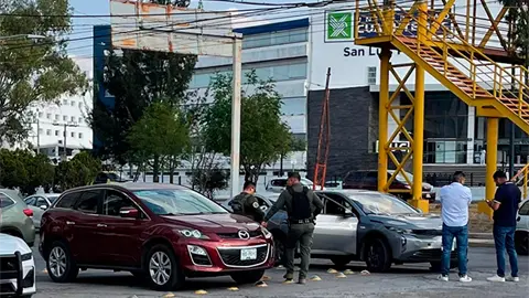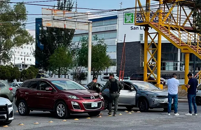 Dos vehículos participaron en un accidente vial al circular por la avenida Salvador Nava Martínez, a la altura de la Universidad Cuauhtémoc, donde por suerte no hubo personas lesionadas.