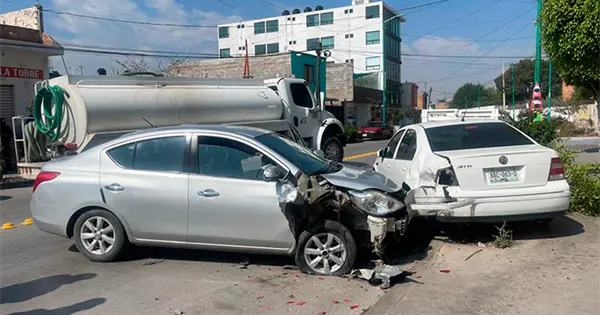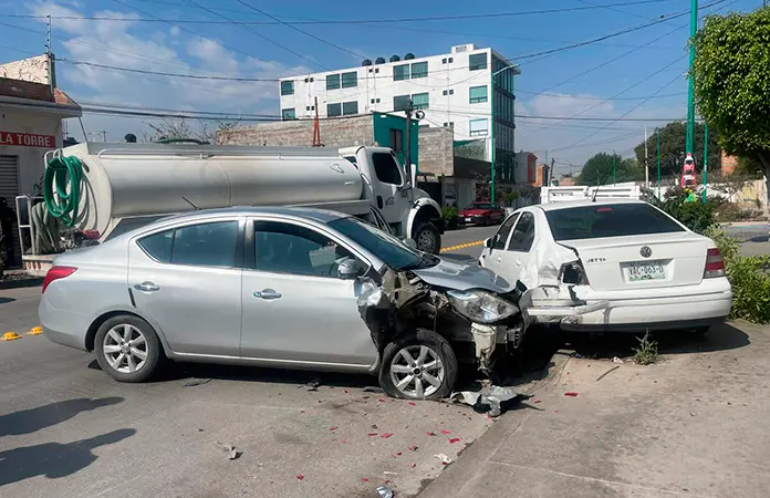 Fue a la altura de la calle Juan Álvarez cuando el conductor perdió el control del volante a la derecha y así chocó el ángulo delantero derecho contra el ángulo posterior izquierdo de un automóvil Volkswagen Jetta de color blanco, el cual se encontraba estacionado junto a la guarnición. Por el golpe recibido el carro estacionado fue proyectado a un costado y acabó encima de la banqueta, ambos vehículos terminaron con daños materiales de consideración.