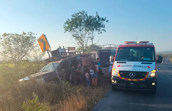 CIUDAD VALLES.- Comerciantes que se dirigían a las instalaciones de la feria de Ciudad Valles sufrieron un accidente en la carretera federal Valles-Mante.