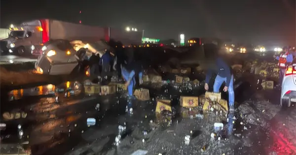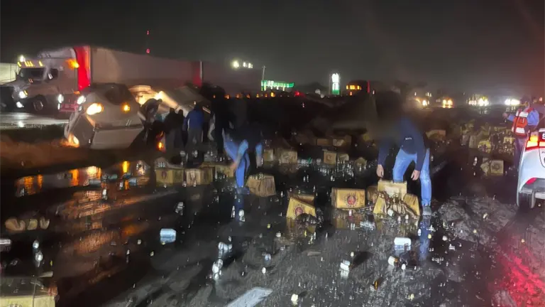 Tras el accidente, decenas de cajas quedaron esparcidas sobre el pavimento, junto con botellas rotas y otras intactas. En cuestión de minutos, varias personas comenzaron a llevarse parte de la carga antes de que arribaran las autoridades.