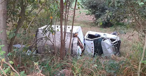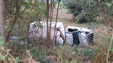 TAMUÍN.- Una camioneta doble rodada repartidora de Maseca, se salió del camino y volcó hacia un desnivel cuando circulaba por la carretera estatal Tamuín-San Vicente.