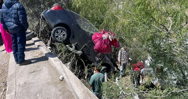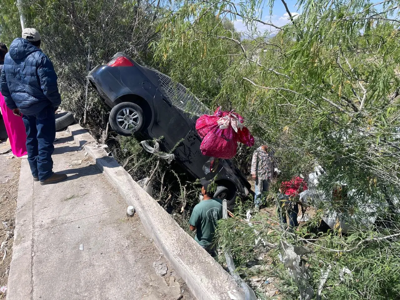 Metros antes de llegar a la calle Primera Primavera, el conductor perdió el control hacia su derecha y salió del camino, cayendo a un desnivel.