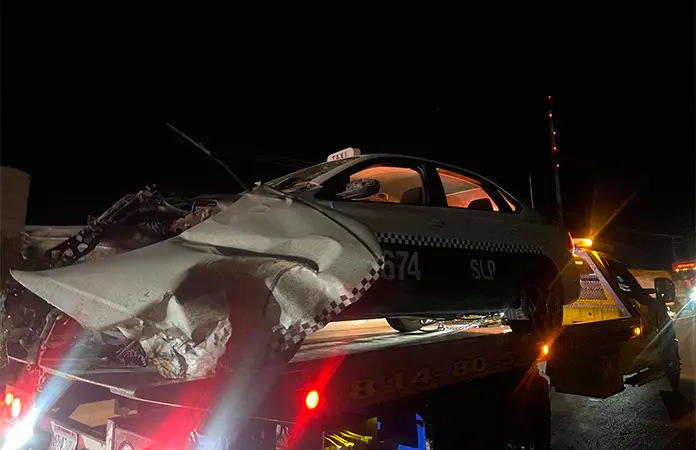 Tres muertos y la pérdida total de los vehículos participantes, es el saldo de un fuerte accidente ocurrido la noche del domingo en la carretera a Rioverde, en donde participaron un auto particular y un taxi.