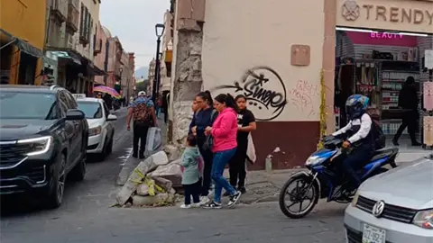 Comerciantes del Centro Histórico mostraron el área afectada por la caída de piezas de cantera, de la que ya habían advertido con meses de anticipación, pero nadie la reparó hasta que finalmente se derrumbó.