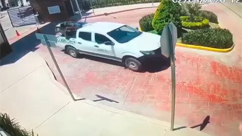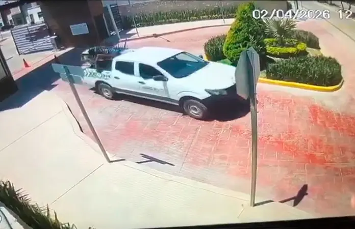 La cámara, ubicada en la caseta de vigilancia, grabó cuando la unidad, con logotipo de Gobierno del Estado y leyenda de la CEBP, abandonaba la privada transportando muebles en la caja.