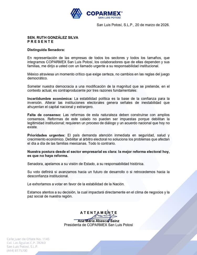 La Coparmex en San Luis Potosí dirigió una carta a los senadores por la entidad para exigirles que no apoyen la Reforma Electoral que pretende la presidenta Claudia Sheinbaum Pardo.