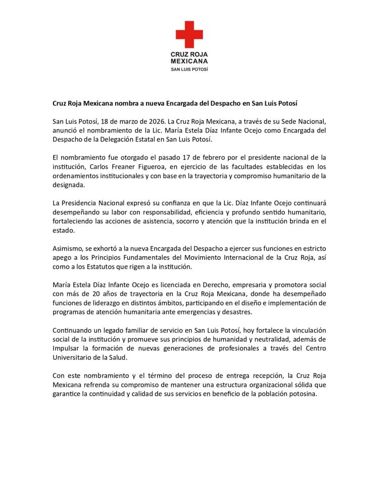 La Cruz Roja Mexicana, informó que ha designado a María Estela Díaz Infante Ocejo como Encargada de Despacho de la Delegación de San Luis Potosí.