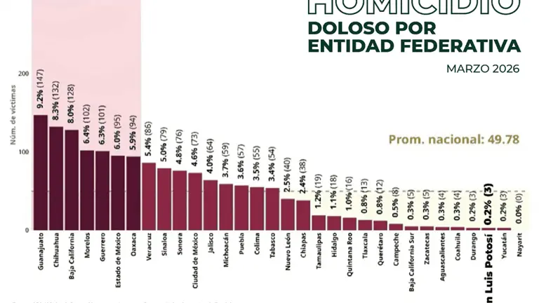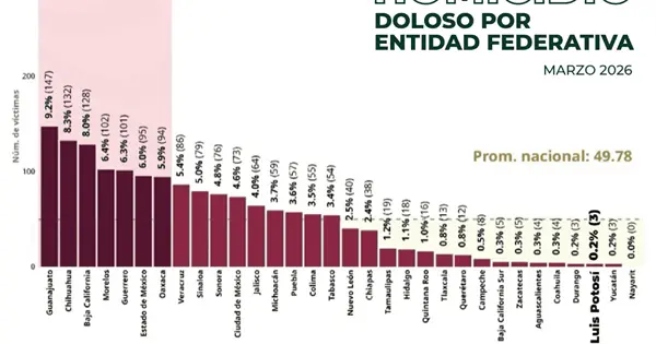 San Luis Potosí se ubicó entre las entidades con menor incidencia de homicidio doloso en marzo de 2026, con tres casos registrados, de acuerdo con datos presentados durante la conferencia matutina de la presidenta Claudia Sheinbaum Pardo.